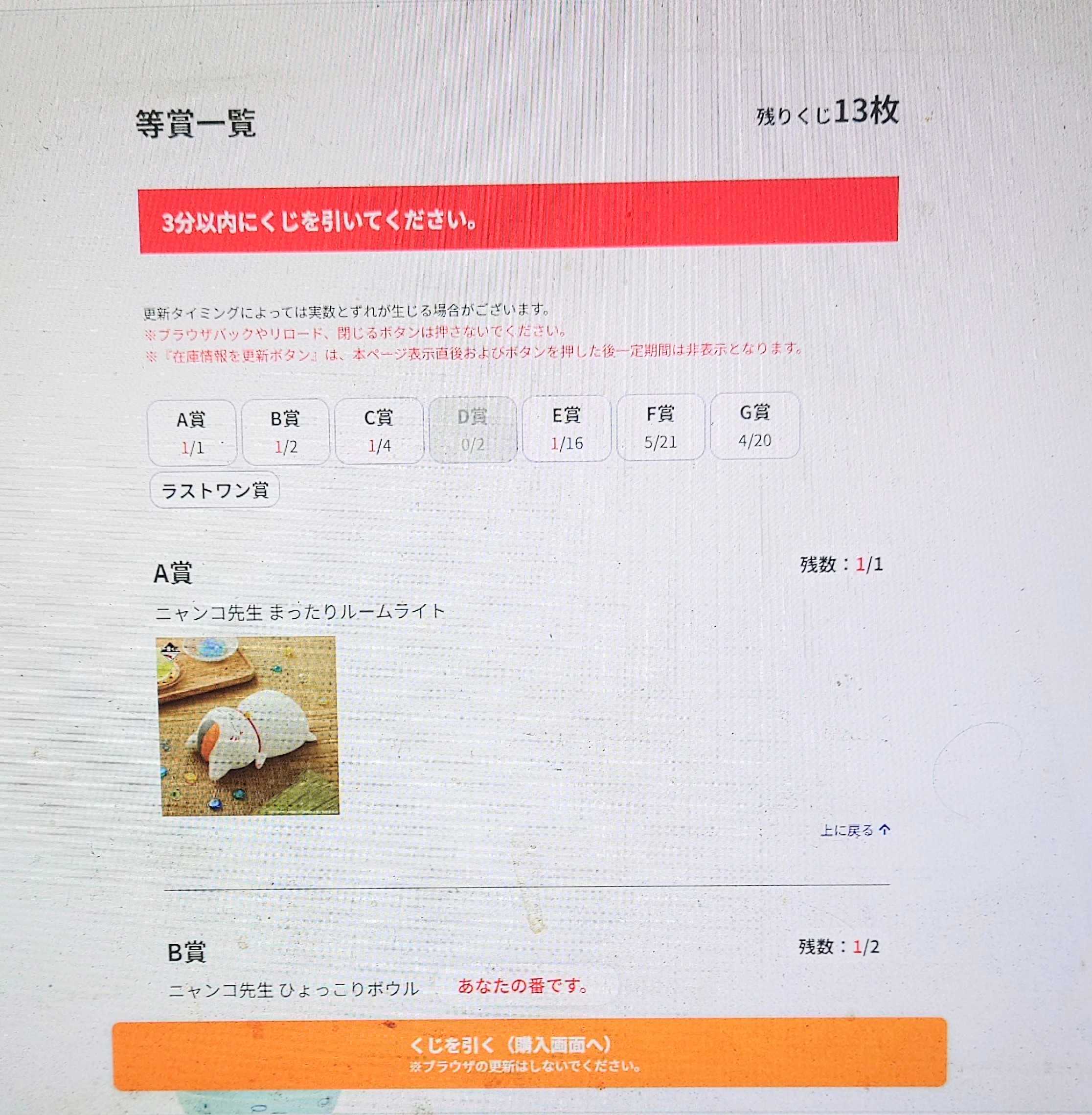 「夏目友人帳 暑中お見舞い申し上げます。」ONLINE残り13本A賞 B賞 C賞 D賞 E賞 F賞 G賞 1/1 1/2 1/4 0/2 1/16 5/21 4/20これは全買い案件行きま~す!Aニャンコ先生 まったりルームライトカワ(・∀・)イイ!!Bニャンコ先生 ひょっこりボウル 2個目 何個でもC蚊取り線香ぬいぐるみマスコット リオウ(黒にゃんこ)Eガラスコレクションラスイチ そうめんつゆ入れF&G 略ラストワン賞ニャンコ先生 スイカぬいぐるみスイカ・コスのにゃんこ先生可愛いです運良く神残りで回ってきてラッキーでした~お次は、「一番くじ ホロライブ ~Wedding Dress Style~」楽しみにしています