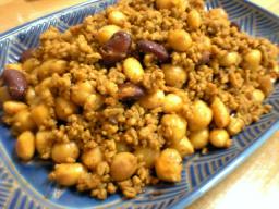 暑い日が続きますね~。梅雨はどこへ行ってしまったの?暑いとなぜだか食べたくなるカレー。今夜はドライカレーを作ってみました今日の晩ご飯・挽き肉とお豆のドライカレー・わかめときゅうりのお酢の物・ヨーグルトと手作りチーズのブルーベリーソース(デザートです) ドライカレー、ほんとに簡単♪しかも作り置きもできて、優れものなお料理です豚挽き肉をよくほぐしながら炒め、下茹でした豆(キドニービーンズやひよこ豆、大豆等)を入れて塩コショウでよく炒めます。隠し味にトマトケチャップとお醤油で味をつけ、水分が飛んでいい感じになったらカレー粉を入れてさっと炒めます。よく混ざったら火を止めて最後にもう一度、大さじ1杯のカレー粉を混ぜたら出来上がり~簡単で美味しいドライカレー♪カレー粉は炒めすぎると香りが飛んでしまうので、最後の大さじ1杯は火を止めて混ぜます。こうするとカレーのいい香りが出ますよ~。たくさんできたら小分けして冷凍庫へ。美味しくてストックもできる美味しいカレーができました。今日のデザートは、手作りチーズ(作り方はこちら)をヨーグルトにのせてブルーベリーソースをかけた、さっぱりデザートです見た目もさわやかできれい 美味しかったです。朝食にもいいかも~。今夜も美味しい食事、ご馳走様でした~♪