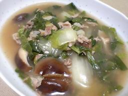今日は白菜と豚肉でスープを作ってみました。今日の晩ご飯・白菜と豚肉のとろみスープ・トマトとレタスのサラダ・高野豆腐と干し椎茸の煮物・きびご飯 豚肉と白菜、椎茸を塩、コショウで炒めます。白菜の芯がだいぶ炒まったところに中華スープをたっぷり注ぎます。味付けは好みですが、私はオイスターソースを多めに入れました最後に水溶き片栗粉で軽くとろみをつけて出来上がり家に残った野菜でも応用できますよね~。簡単で美味しいスープになりました♪スープを少なめにし、とろみを強くしてご飯にかければ、あんかけご飯にもなります美味しかった~!高野豆腐と干し椎茸の煮物は母が作ってくれました~これもとっても美味しかった今日も美味しい食卓になりました、ごちそう様でした~♪