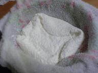 2、3日か前から、チーズも手作りしてみたいなぁと思っていたんですけどついに手作りしちゃいました~材料 牛乳1リットル、レモン汁100ml牛乳を60℃位に温めます。60℃といってもどれ位の熱さがわからないですよね…なので私は指を入れれるか入れれないか位の熱さ(かなり熱い)、で、判断しました(笑)。でもまあそんなに厳密に60℃じゃなくても大丈夫。火を止めて、レモン汁を回し入れます。木べらで軽く混ぜて15分位そのまま置いておきます。牛乳が分離してきたら、ザルにふきんを敷いてこします。 水分(ホエー)がほとんど落ちるまでしばらく置いたら、ふきんで包んで絞り、さらに水分を落とします。水分をきったら器に入れて冷やしたら出来上がり真っ白でヘルシーなカッテージチーズの出来上がりです♪ お家にある牛乳とレモン汁で簡単に出来ちゃうので、これからは買う必要ないかも~。簡単でヘルシーなチーズが出来ちゃうんだから素敵~カッテージチーズを使ったお料理って何かあるかしら…?