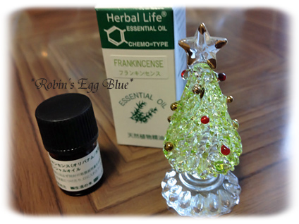 Merry Christmas.+*゜今日はクリスマスですねっ・:*:・(〃^ー^〃)・:*:・我が家では、ささやか~なクリスマスを過ごしております♪まぁ2人なので、小さいケーキと、小さいプレゼント交換といった感じ。(*^^*)今年は、さらに(!?)小さい雑貨たちが、雰囲気を作ってくれていました。ガラスで出来たミニ・クリスマスツリー、それから、とっても良い香りがするオイルです.+*゜テーブルに、ちょこんと置くだけでもガラスのツリーの可愛さにニッコリ。大きなツリーは、置くスペースがないので買えないのですが、これならOK!ヾ( ̄▽ ̄*)良い香りのオイルのほうは、フランキンセンスというもの.+*゜爽やかで心地よい、木の香りがします。(*v.v)本やサイトで見かけてから、ずっと気になっていて。近所の雑貨屋さんにポツンと置いてあったのを見て、嬉しくなっちゃいましたフランキンセンスは、ソマリア、エチオピアなどの乾燥した地域に育つ、カンラン科の植物。木や樹脂を焚いたときにたちのぼる煙は、人々の祈りを神に届けるとされ、旧約聖書の時代から、人々の祈りを神に捧げるために焚かれてきたそうです。この香りが、クリスマスにピッタリだなぁ♪と思うことも.+*゜キリスト誕生の際に、東方の三賢者が贈った贈り物が、人の証としてのミルラ(没薬)、王の証としての黄金、そして神の証としてのフランキンセンスだったこと。この贈り物が、クリスマスプレゼントの起源になったとも言われているそう。歴史をおもうと、ちょっとドキドキしてきます。("▽"*)さらにさらに.+*゜フランキンセンスの香りは、ストレスや緊張を和らげ、雑念を払い、心に平和をもたらす効能があるとされているそうなんです。気持ちが、心がほっとする.+*゜確かに、そんな雰囲気のする木の香りで、このところ欠かせない香りになっています。ミネラルウォーターに数滴いれたミストを、シュシュッっとしたり.+*゜このボトルは、精油のボトルなので、他にも色々と楽しみ方がありそう。そちらの方も、ちょっと楽しみです。(*^^*)大好きなものが増えるって、ほんとシアワセです。(笑)