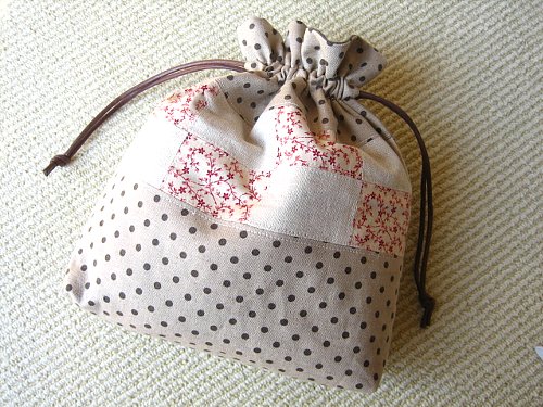 昨日の車は、やはり保険を使うことにしました。等級もだいぶ上のほうだったので、下がってもまぁ来年の支払いの痛みは少ないと判断。それでも、やはり凹んでしまった私でしたしゃーないなぁ・・・(;´д`)トホホさて、実家近所の昨日お友達の家に行ったとき「鞄の中を整理したいから【巾着】が欲しいねん」と言ってくれてたいので、早速作ってみました。なにやら、いつも作っているものとは違うものを作りたくなって、パッチしました。どうでしょうハーフリネンのベージュ地にチョコドットです表だけコットンとワッフルでパッチしてみましたパッチ部分の拡大です中生地はリネン70・コットン30の茶系(深いグリーンにも見えますが茶として買いました)のハーフリネンの無地です まだ一点しか作っていないので、あと何点か作ってから見せてみようかなと思っています。あこれが先に気になった方がいらっしゃいましたら、メールからご連絡くださいねまだお友達に見せていないので*ろびん*ショップには出していません。ランキング見つけられない彼方にいるみたいです・・・ポチッとランキングも宜しくです ←*ろびん*ショップです ← 参加しています。 ポチッ とお願いします。