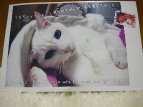 さっぶいさっぶいーーー!と、言いながら家に帰ったら素敵なハガキが届いていましたそれはそれは、すえこさんのセクシー(?)ショット♪ Ms. Sueko!!!しかも、猫界演歌の女王『山形雪子さん』 のシールつき! 『五十路超え』 先日、『しろいねこ』の『奥さんな?あーた3周年企画しよるてバイ! なんしょっと、はよ応募しときなっせ!』企画・・・に応募したところ(企画名ぱくって偽造・・・)見事、はずれ・・・。マイガッ! それなのに、応募者全員にこんな素敵なブロマイドカード送ってくださるなんてよっ、めわさん太っ腹! 私も次のプレゼント企画はちょいと頑張ろう・・・。 で、リンリン今日はちょいと渋め そして、仲良し二人の仲むつまじい動画です。最初 ウットリ中 ケリケリ腹 触ってもおっぴろげ・・・ →さわんなっつーの!!最近の動画、あんまり仲良く見えないですね。。。。お気に召しましたら押してくださいまし人気blogランキング