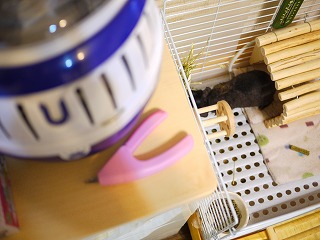 プチプチで覆ってしまったから私がいつもいる場所からルイちゃんが見えにくく。 ルイちゃんからも私が見えないから、スロープまで出てきてこちらを見ていることが多くなってきた☆これはこれでスゴクかわいいけど、振り向いたらいつもルイちゃんが見えるように模様替え。 よし!これでOK♪ケージの前面がこちらに向いていて中の様子がよくわかる☆ミッキーのハウスは安かったから衝動買いしちゃったけど、犬猫用?の大きさで・・・。 外から色々とチェックしているようです。結果、1回だけ入ってすぐに出てきてそれっきり>< ワイヤーラックで手作りしたサークルは、広げると倍の広さに^^時々全速力でクルクル走り回っています^^