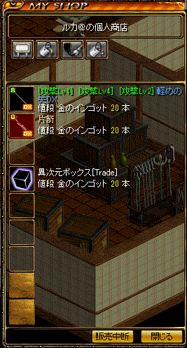 2倍を経てメインのアチャは844Lvまで上がりました!片箭までもうちょいなんだけどオアシスまずいしどうしようか・・。と悩んでいたがGvに出たい為知恵ステをGvステに直してしまったので、Lv上げは一旦中止!!!になりました。その代わり445Lvで止まっていたシーフをGvに出れる位育ててやるぜ!!!という突然の思いつきで、ここ5日間で515Lvまで上げました。天上いかないと?転生3回しないと指が・・?と早くも挫折しそうになりかけましたが、とりあえず4転目指して上げていこうと思ってますwと、まぁ本編はここからなんですがふとアリアンで露店チェックしているとあるじゃないですか!!!片箭が!!!!これはもう天にやれと言われている。そう思ったので、次も絶対見てくれよな!!!