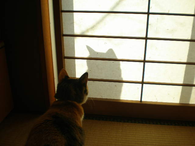 最近我が家の庭に出没する・・・その名も「2ミリ君」何故2ミリ君なのかといえば・・・小梅ちゃんがサッシの2ミリのスキマから覗くようにして見てるからなんですね。今日も2ミリ君が来ると、隙間からおそ~~るおそ~~~る見てる・・・もういい加減なれたらどうなのかな?ちなみに小竹ちゃんはあまり興味なし・・・