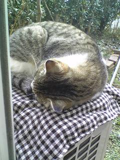 2ミリ君は判で押したように、7時には必ず庭にやってきます。そして室外機の上で午前中はお昼ね。お昼過ぎに思い出したように、席を立ち・・・1時間ほどしてまた戻ってきて、室外機の上で毛づくろい・・・ということは、帰る家があるんだね。ビッグママは室外機の上に座布団まで作っちゃったよ。2ミリ君専用です。最近ママたんたちたら、2ミリ君の話でもちきり。