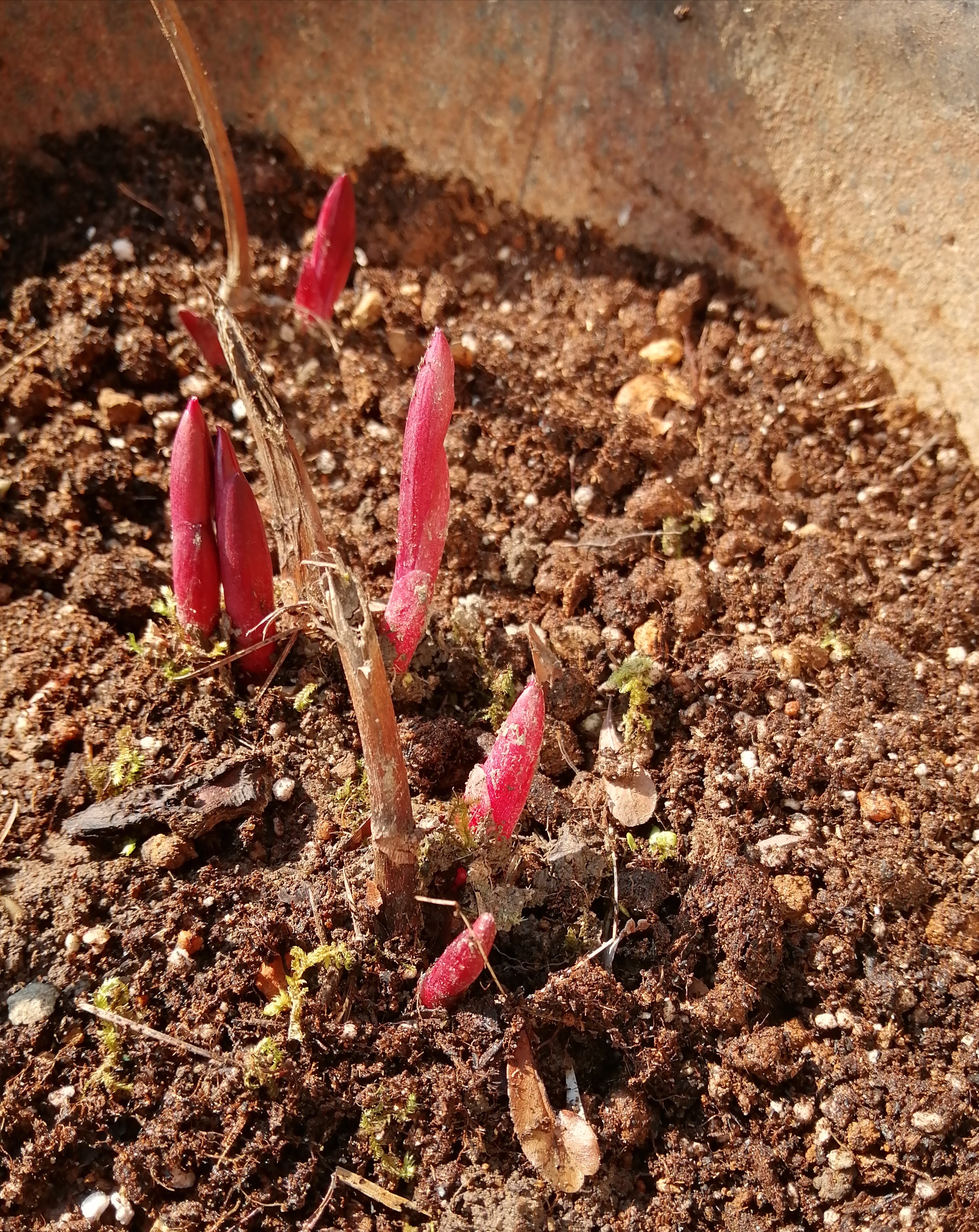 3月19日(水)ちょっと暖かくなったのでクレマチスの芽が動き出してワクワク…ハッピーダイアナ昨年、お迎えしてお花は咲かなかったのですが今春新芽が出てきたのでお花 見れるかなぁ枯れたかな…と心配していた"藤かほり"も新芽が出てきてよかったε-(´∀`*)ホックレマチス茎が枯れ枯れになってしまうので生きているのかわからないよね… こうして新芽が出てくるとホッとする挿し木が根付いた"日向"この子も怪しかったのだけれど脇芽が成長して土中からも新芽が出てきてうれしいよ!!↑の親株です土中からた~くさんの新芽が出てきたのよこんな風に新芽が出てくるとは思ってなかったのでちょっとびっくりしてます2月初旬に小さい苗をゲットして育つかなぁと心配していましたが毎朝、覗いていてどちらも芽が動き出して少しずつ大きくなっているなぁ…とワクワクしてます頑張れ~ラッパ水仙約1週間でこんな風に変化しました黄色一色が少し増えたでしょ