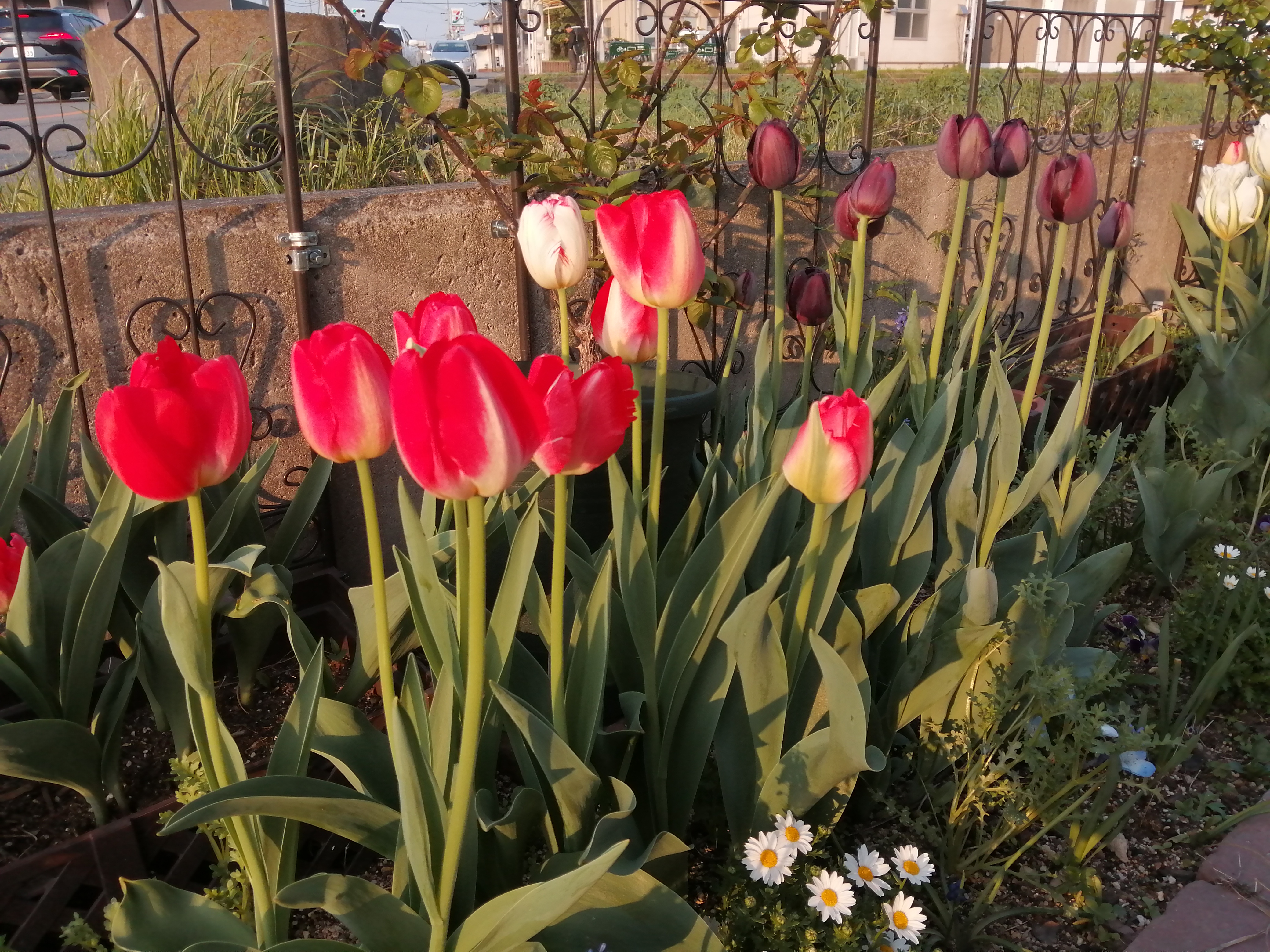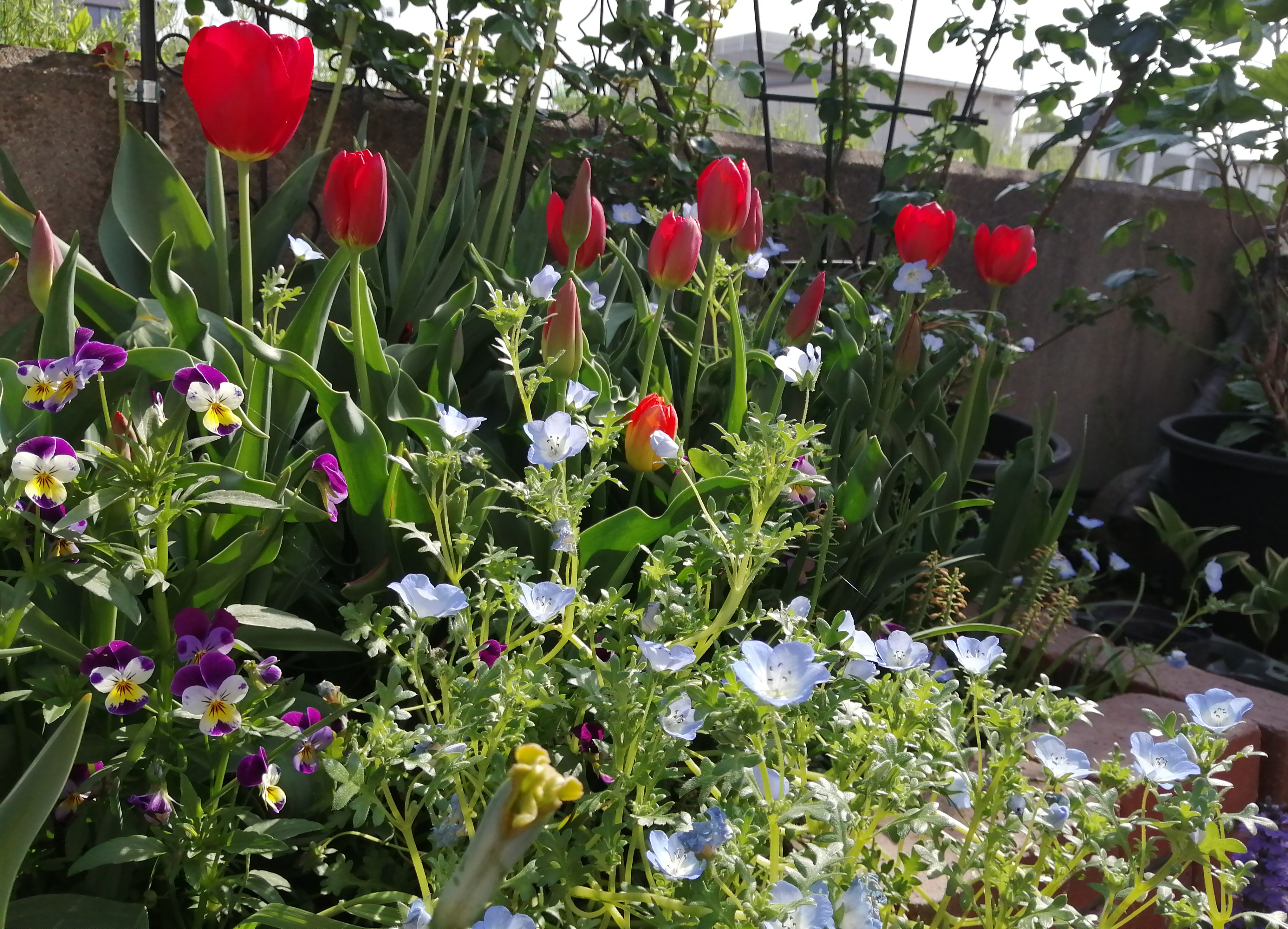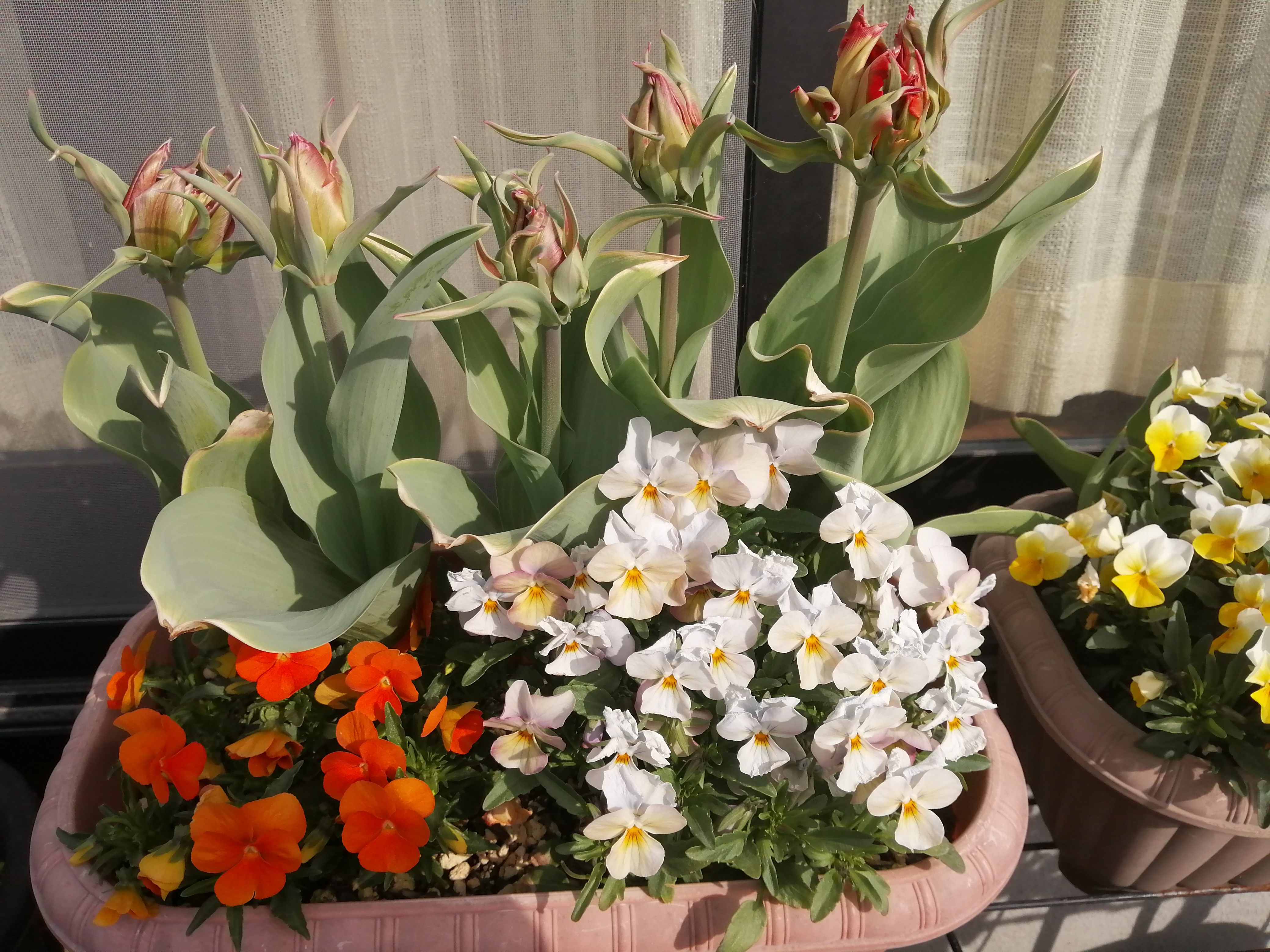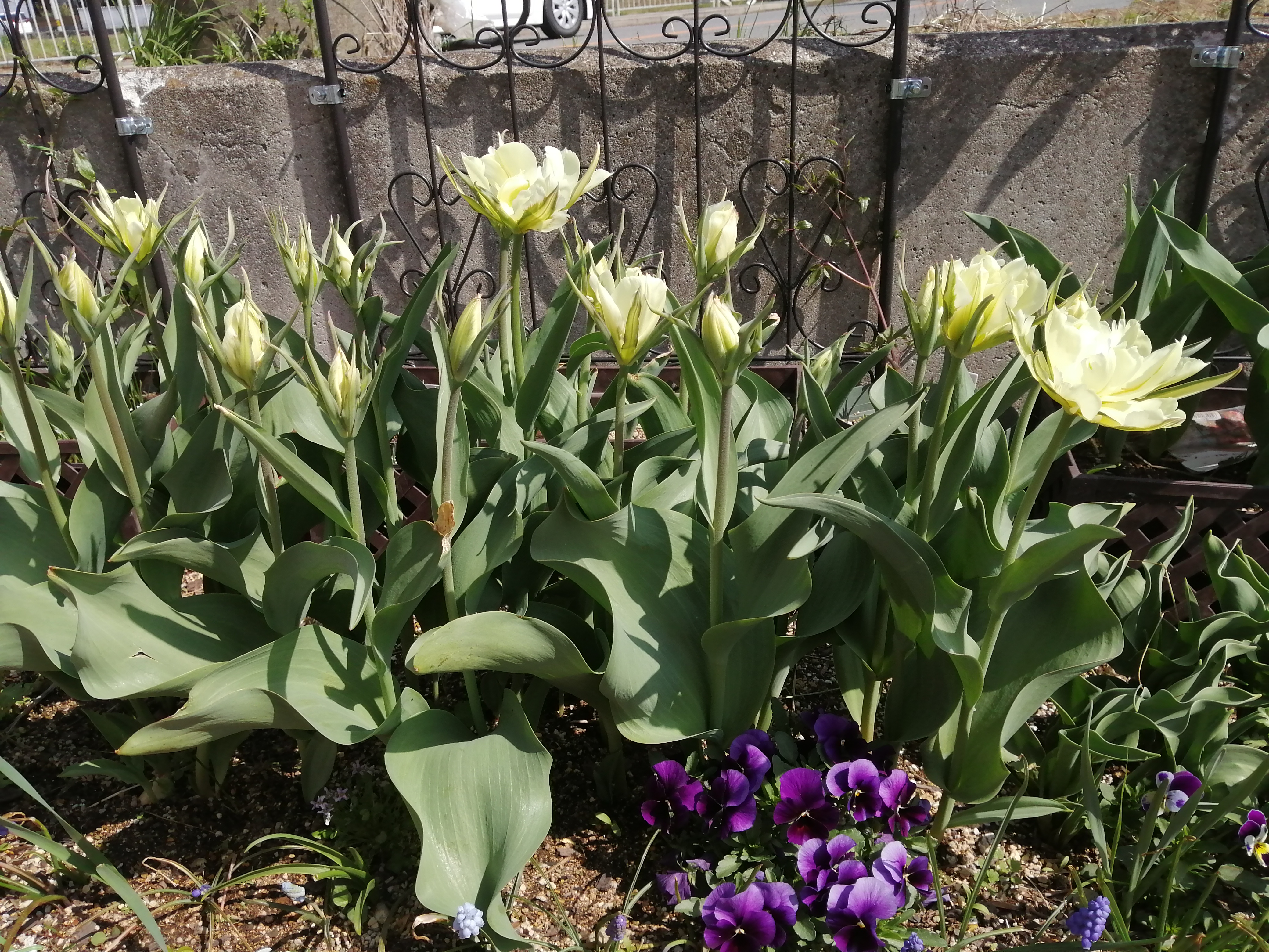4月16日(水)先日来、大気が不安定で雷が鳴ったり、雨が降ったりして寒い日もあったのですが今日は、風が冷たいけれど、いいお天気になりました。Tulipが花盛りぃ始めに咲いたホワイトバレーだんだんお花が大きくなってとっても豪華になりましたその両脇で徳用チューリップ 桃白が咲いて春爛漫前年度の🌷まとめて植え付けたらいろんな子が咲いてうれしいわぁ雨のおかげ(?)花茎が伸びてどの子も背高ノッポさんに…ビオラも花盛りプリティーレディーさんプリティーウーマンさん気温が低かったからかまだきれいに咲いてくれていて華やかさが増してにぎやかになってますもう少しの間愉しませてね