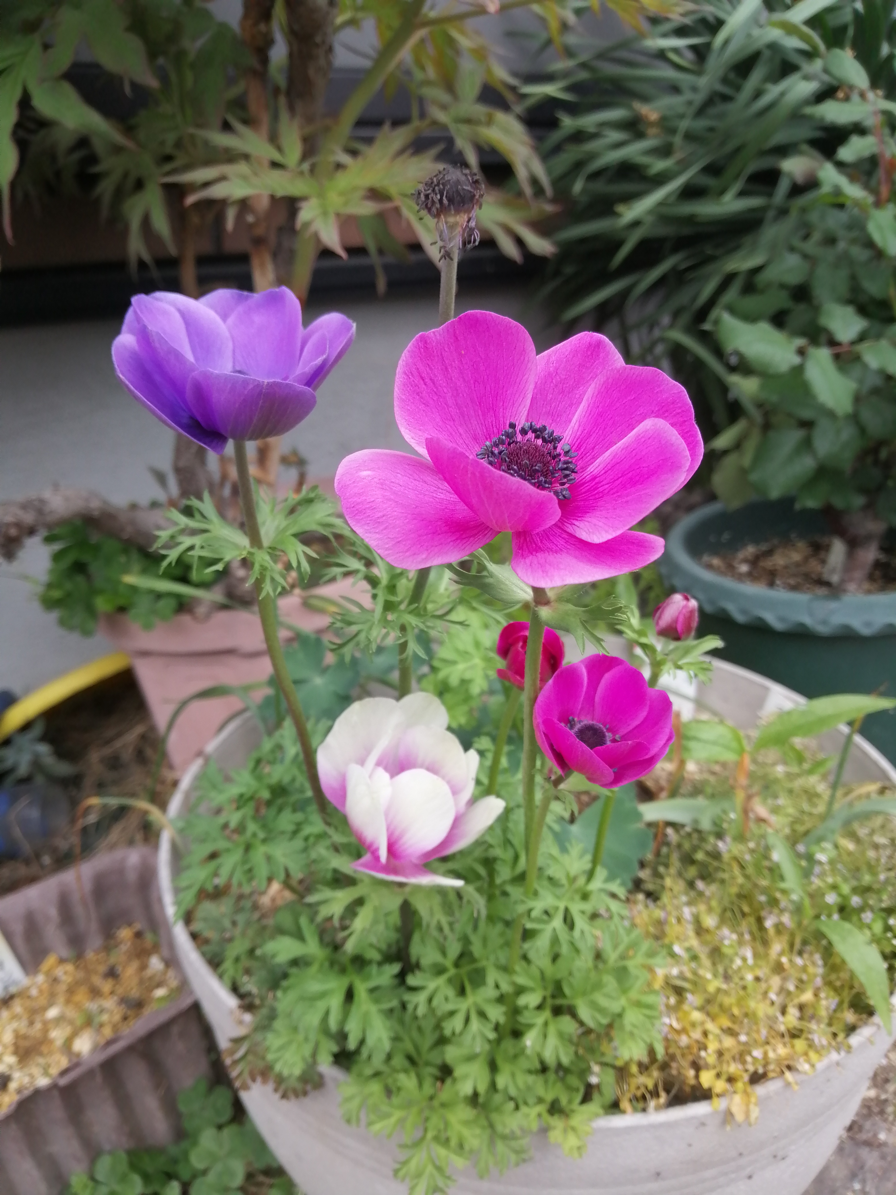 4月20日(日)どんよりとして、蒸し蒸ししたお天気の朝ですアネモネが次々と咲き出しました!(^^)!ミックスの球根なので咲くまでわからない…真ん中がピンクで白いお花 初めて…可愛いい~桜草も花盛りぃ株分けしたり地植えにしたりしたのであちこちで咲いてます毎年、小さい芽ができるので分けてやるときれいに咲くことが分かった(∀`*ゞ)エヘヘどんどん増えてます地植えにしているお花が大きくてきれいなので植木鉢から移植してみましたここで育ってくれたらいいな何処からやってきたわからない桜草だけれど始めの頃は葉っぱばかりでお花が咲かなかったので一度は処分しようとしたのだけれど置いておいてよかった