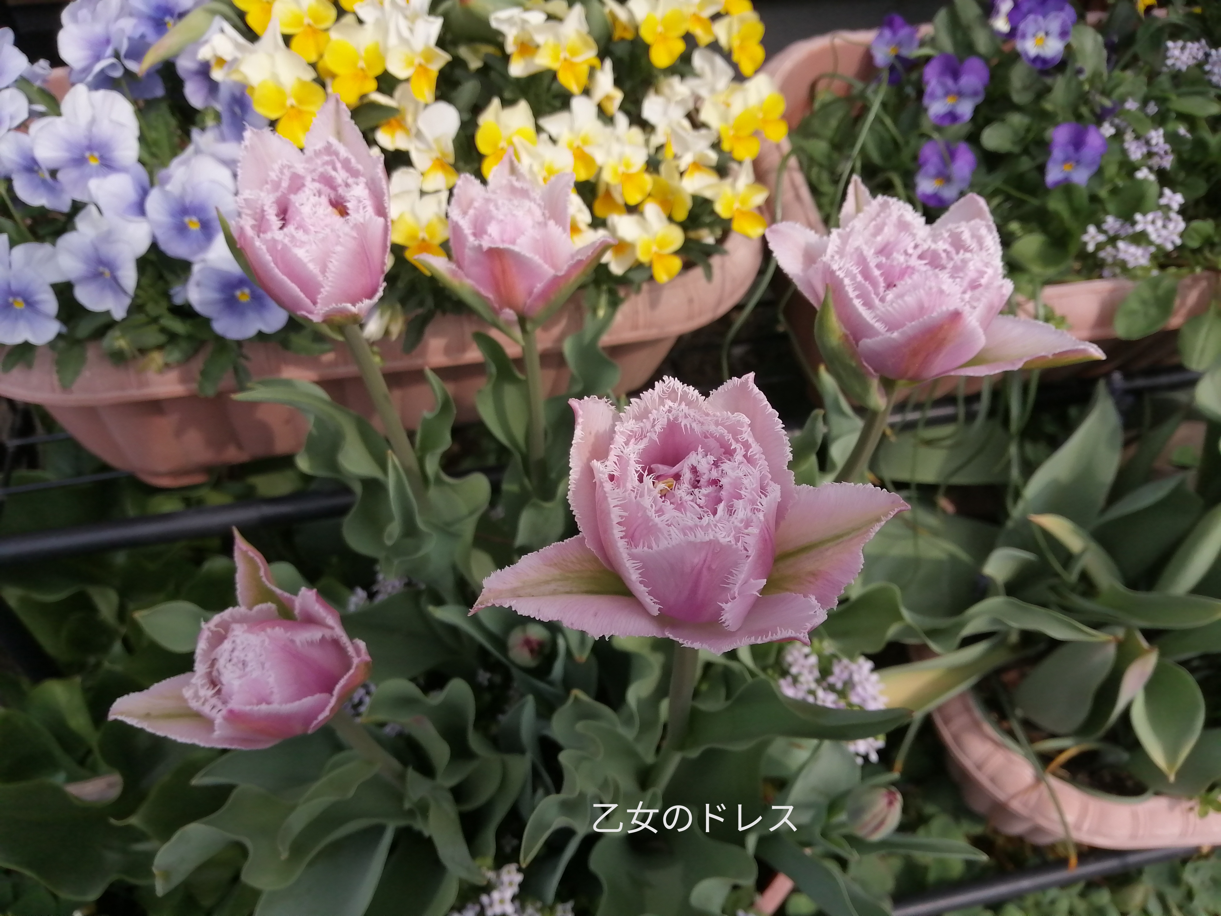 4月11日(金)昨日は、夕方に雷が鳴り大雨が降ってビックリのお天気でした(>_<)朝は、いいお天気だったのにねチューリップが次々と開花乙女のドレス花びらが幾重にも重なってドレスのような華やかさがあるチューリップでしょ花びらにギザギザが入り花色も素敵~濃いピンクでツンツンと花びらがとんがってこの子も可愛いぃ~ね同じようなユリ咲きの赤色のチューリップすてきな花名が付けられていて楽しくなります前年度掘り上げたTULIPの寄せ植えどんな子が咲くかドキドキしてたら濃い紫のお花がしぶ~く開花乙女のドレスと並んでもらいましたっ
