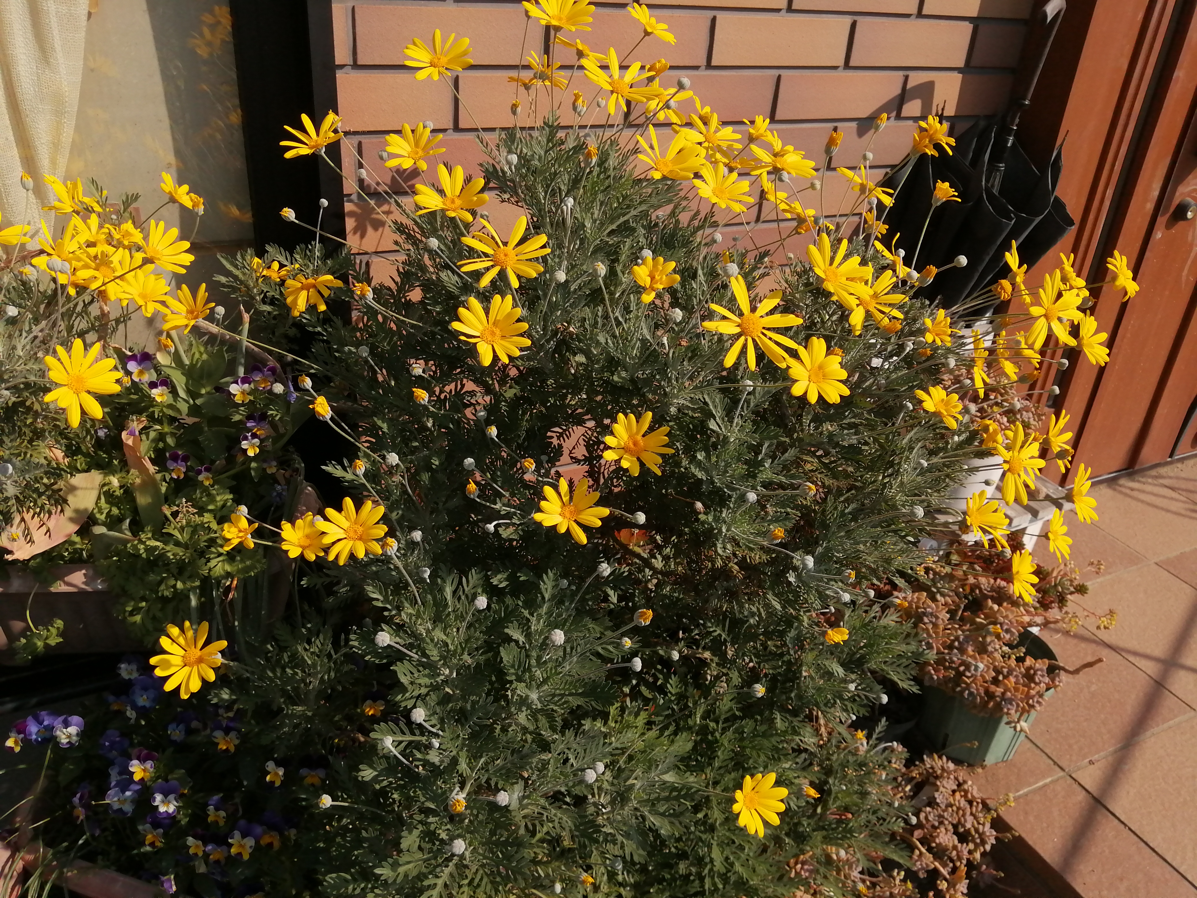 4月26日(土)朝は、風が冷たくて気温も低かったようだけれど暑いぐらいのお天気になりました。玄関横で大きくなったユリオプスデージー鉢植えにしていたのにここが気に入ったのか鉢底から根が出て動かせなくなってますついこの間、邪魔になったので切り戻したらまた、お花が咲き始めました木質化してますビオラそろそろ終わりかなぁ…と思いつつ今迄フラースタンドにまっすぐに並べていたんだけれどプランターをちょっと斜めにして並べてみたら雰囲気が変わってまだまだ愉しめるかも…と今年は気温がちょっと低いおかげなのかあまり徒長してないような気がします
