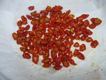 ドライトマトの第2弾、天日干しです。3日間天日干ししたらこんなに綺麗なドライトマトが出来ました。オーブンで焼くのは手っ取り早いけれど、やっぱり天日干しにはかないませんね。味も甘みが増して美味しいです。鯵の干物の素揚げ鯵をまた干して干物を作ったら、丁度TVで干物の素揚げを放映していました。すぐにまねして見ました・・・美味しかったですよ。干物をそのまま油で揚げて、レモンを絞っていただきます。一緒に添えてあるのはするめいかとじゃこの天ぷらです。大根と胡瓜のおろし冷製パスタ昨日の朝は冷製パスタに しました。茹でて冷たくしたパスタに大根ときゅうりおろしをのせ、シーチキンをトッピング、キンキンに冷やしためんつゆをかける。これはさっぱりとして美味しかったです。 かぼちゃと枝豆のコロッケかぼちゃ3に対しじゃが芋1ぐらいの割合でまぜ、枝豆とコーンを混ぜ塩コショウしただけのコロッケです。かぼちゃの甘みと枝豆の食感が美味しいコロッケになりました。烏賊刺しのおろしあえこれもTVで美味しい烏賊刺しの作り方を放映していて、大根おろしとしょうが、醤油を混ぜ混ぜし、熱いご飯に乗せて食べると抜群に美味しいとか。作ってすぐにおつまみとして食べられちゃいました。もう少しで跡形も無くなるところでした。 煮物この糸こんが食べたかったようで、ありあわせの野菜で煮物を作りました。鰹のたたき変わった魚料理がなかなか出来なくて、お魚屋さんにも種類はあまり並んでいませんね。サラダお中元やお歳暮でハムを頂きます。出来るだけ使い切るように心がけては居るけれど、多くなると冷凍庫に残ったままになってしまいう。最近はハムは嬉しくないです。