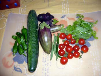画像や動画を取り込むと恐ろしいほど固まるPCにズーッと四苦八苦。特にこのblogは画像をUPしなきゃならないので余計に放置状態。 リカバリーしたりいらない画像を消したりしても解消せず。古いモニターに変えてみたらすんなり解消してしまいました。そんなこんなでまた半月過ぎてしまいました。今年はなかなか梅雨が空けないのに、野菜の出来は上々です。白茄子と思って植えた苗に妙な色のなすが成りました。味は白茄子と同じようです。気が付かずに大きくなりすぎた胡瓜をどう使うかズッキーニーと思えばいいんですよね。 ラタトウユを作って見ました。 ラタトウユ胡瓜(ズッキーニー)、茄子、トマト、ししとう、玉ねぎ、インゲン、ニンニク、バジル、スープセロリ、 ブイヨン、トマト缶 一口大に野菜を切る。微塵きりにしたニンニクをオリーブオイルで炒め、薄切りにした玉ねぎと、全ての野菜を炒め、トマト缶を入れてコンソメと一緒に煮込む。仕上がりに塩コショウする。 ミニトマトのマリネと鶏のバジル焼きミニトマトの皮を湯ムキして、オリーブオイル、みじん切り玉ねぎ、レモン汁、塩コショウ、砂糖少々の中に漬けて冷やす。仕上げにミントの葉をのせて。ちょっと変わったトマト料理です。種から育てたモロッコインゲンが今沢山実り始めました。もちろん天ぷらが一番好きなまりと大根の煮物生の鰹よりなまりのほうをよく使います。大根とくつくつ煮込んで。魚卵の煮物多分ぶりの卵だったと思います。ゆっくりことこと煮込んだ卵はごはんのおともによく合います。マグロのつくね赤身の剥身を細かく叩いて、小ねぎ、卵少々、味噌、みりん、摩り下ろししょうがをよく混ぜ片栗を少しだけ混ぜてごま油で焼く。味が付いているのでそのままで。 きのこのうまにしめじ、エリンギ、舞茸、ブロッコリーをバターで炒め、みりん、醤油、塩コショウで味付けする。