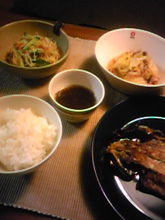 今日の夕飯、一人分約145円でした(笑)はなぞうさんっ、うちも例のもやしメニュー作ってみました!!もやし一袋17円でしたよ~~。これ、梅干の単価が一番高いかも・・・。じゃこがなかったので、しらす釜揚げを冷凍してたのを使いました。左上がそのメニュー。もやし、きゅうり、じゃこをごま油、しょうゆ、酢で混ぜて~、梅干ちぎって、白ゴマかけただけ。もやしって生でいいのかな?私は軽く茹でました。あとは真ん中もずく、あじの開きは半額になってて1匹45円くらい。右上は豚バラと白菜の煮物。いつも簡単なので肉メインのメニューばかりでしたが、肉だけで1000円前後かかってました。だから二日分の買い物しかしてなのに4000円越えの日々・・・。これからは節約レシピ本とにらめっこして、食費を節約してみようと思います。