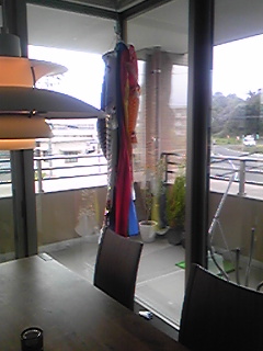 風が一日中吹いてました。午前中からヒドかったので午後にはおさまるだろうとおもってましたが、結局夜中まで!?強風は続いたのかな?寝てたのでわかりませんが。旦那も帰りの電車が止まってしまい、せっかく早く帰れたのに結局いつもと同じ時間くらいになってしまいました。 昨日の昼間の様子。鯉のぼりは家の中へブラ~んとまとめて(笑)PH5は昼間の雨の日、部屋が暗いからと明かりを点けても全然明るくなりません。こんな感じ。昼間は蛍光灯のほうが良いですね!鯉のぼりも最初は抵抗がすごいだろうと、鯉だけをポールから外したのですが、ポールだけになっても、上の風車みたいなのが激しく回りすぎて、吹っ飛んで行ってしまい通行人にブチ当たって大怪我。なんてことも想像しちゃて怖くなったので、強風に吹かれながら必死でロープなどもはずして土台のみに。ベランダのテーブルはひっくり返し、椅子は風が避けれる出窓の下へ避難。こうゆう時にベランダにモノを置いてないとラクだろうな~と思いました。留守のときにこんな嵐みたいな強風が吹いたら、ウチのベランダのあらゆるものが飛んで行ってしまうかも。危険すぎる~~!!今朝、起きたら一番大きな陶器の植木鉢が倒れて、割れて(欠けて)ました。一部なので見えないように裏に回しますけど。マンションの風って強いですね。普段もかなりヒューヒュー吹いてます。なのでベランダでのんびりお茶なんてまだできてないですね~。春風は強いのかしら?夏はそんなに気にならなかったんですけど。