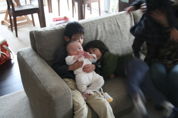 産んでました!女の子です。生後3ヶ月になりました。次男もお兄ちゃんになりました。なんて冗談ですが。って、最初からバレてた?同級生の赤ちゃんです。しかも初めての子。なのにすんごい落ち着いてゆとりの育児をしてました。肝がすわってます。久々に、初めて我が家に遊びに来る友達だったので、朝から気合を入れて掃除しましたよ。何回も来たことある友達やご近所さんだと特に今、春休みなので子供達が居るとまともに掃除できないし、洗濯物が山盛りでも平気で招いちゃってましたが(笑)やっぱり最初の印象って大切なのでね。次男が午前中だけ幼稚園に行ってる間、長男をコキ使って?頑張りましたよ。ただ今帰省中の友達で、そう何回も遊びに来れるワケではないので尚更気合が入りました。ウチの子供達、すんごい赤ちゃんに興味津々で、抱っこしてました。3人目は絶対女の子が生まれるという確実な補償があればもう一人欲しいけどな。また男の子だったら産むまでは良いのだけど、育てるのがもう年齢&体力的にキツイです。でも長男はともかく次男までがかわいがってたので、次男をお兄ちゃんにしてあげたい気もしますが・・・。う~ん、やっぱりムリかな(笑)