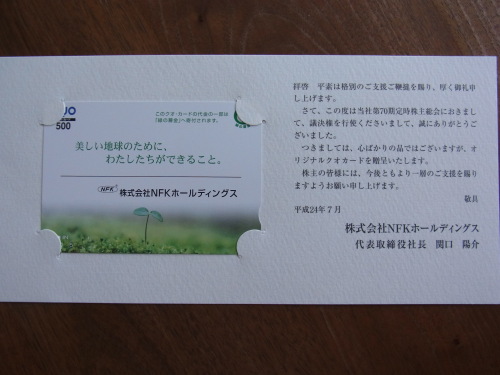 立秋が過ぎて、なんとなく暑さがマシになったと思いませんか?久々に株関連ネタです。株主総会の決議権行使のハガキを送ると、もれなくクオカードを送ってくれる会社があります。NFKホールディングという会社です。買ったときはこんな名前の会社ではなかった!なんとかハーネス??放置してるので、何が何だかわかってません。決議権行使のハガキを送るだけで、クオカードがもらえるなんてスゴイですね。全部の会社がこうだったら、全部ハガキ送るのに(笑)帰省途中に立ち寄るコンビニで使いたいと思います。なんだかんだでクオカードってたまるので、というか私が金目のものは、ためこんでしまう性質なので、どんどん使っていきたいです。引き出しにしまっておいても何にもならないのにね。図書カードも同様。夏休みももう半分くらい過ぎましたね。早過ぎ。まだ何もしてないのに・・・。19日の登校日(親も学校の清掃が・汗)に、作品と読書感想文(次男はトマトの観察と絵日記3枚)を提出しなくてはなりません。来週は帰省するし、それまでに仕上げなくては~~。なんで私がプレッシャーになるの??今日、東京から甥っ子達が帰省してきます。2時半過ぎに駅着なので、それまでに仕上げさせるぞー!ポチっとお願いいたします。