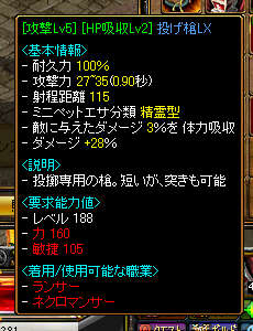 ~本日の前文~ 「It's my precious time! 」 Byイメージテーママキシシングル第一弾「FORTUNE ARTERIAL」 ――――――――――――――――――――――――――――――――――――――――― こんぬつは、、、ルシです(´・ω・)今ニコニコで「中華一番」見てます、ルシですwwさって、今日で2週間前なので・・・赤石におけるPT狩り、Gvは出ません、出れませんです(´・ω・`) ネット状態も悪いんで・・・、すぐ落ちるんで・・・さて・・・銀行の槍のお話・・・↓、これは、HP吸収に微白ダメの乗ってる0.90槍、吸収にひかれたw お値段755万5000円↓、これは攻速43%の1.00槍、速度がいいねw、Gメンがくれたw↓、これはダメ槍113%の0.90槍、ダメ速度的にも好きw 倉庫の物拝領w↓、これは1.70槍の速度33% ダメが少し高いw 250万なりうちの、キャラは・・・アチャ、テイマ、ウィズ、プリ・・・・あれ・・・・おかしいな・・・・ランサなんて・・・・いないなぁ・・・・無駄使いシネwwwwwwwwwwwとっとと、箱三枝買えよバカスwwwwwランサは・・・・嫌いじゃないけど生理的にm(ryGvとかで、妨害とかしたいけど・・・、ビットでバスバスもしたぃ(´・ω`)エントラは嫌いですwwさて、ヒナ様でも奉ろうか(〃∇〃) てれっ☆そんじゃま、ノシ ルシでしたw