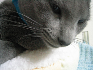 この前の「猫も乾燥肌になる?」で教えてもらった、すき櫛(スリッカーブラシ)なるものを買いました。うちにはラバーブラシがあるのだけど、こういうブラシも気になってました。軽く梳いてあげると、ふわふわの抜け毛が結構取れました。ロシアンブルーって毛が多いものね~。なんだか気に入ってたくさん梳いてあげるのだけど、あんまり長くやっていると、カモ君は飽きてしまうのか、逃げるようになってしまいました・・・でも、抜け毛がたくさん取れてよかったね。