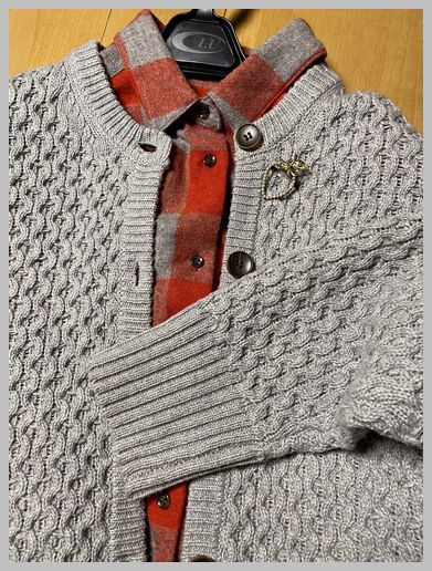 真冬には、同じワンピースにもっとモコっとしたカーディガンやコートを合わせて着ていました。↓このグレーのカーディガンは厚手ですが、グレーに朱色のブロックチェックのワンピースの方が、暖かそうに見えて実は薄手で寒いので、真冬にはあまり着ません。かといって、もっと暖かい季節には素材が冬っぽくてそぐわないし…着られるのは今だけなんですよね(;^_^A7年位前だったか、ディノスのセールで購入したワンピースです。でも、グレーと朱色の組み合わせがとっても好きなんで、着られると嬉しいです。カーディガンは昨年買ったばかりですが、いろんな服に合うので本当に買って良かった!苺のブローチは、母の誕生日か母の日かに私がプレゼントしたもので、母も気に入って使っていました。派手過ぎず私も気に入っているのですが、母の方が似あいましたね・・・色が上手く出ないのですが、濃い紫のカーディガン。これも昨年衝動買いしたものですが、3年位前に買った紫のチェックのワンピースにピッタリの色目で、愛用しています。このチェックはカジュアルですが、砕けすぎないのでいろんな場所に着ていってます。ブローチは数年前にGLADDでかなり安く買えたものですが、確か定価は3万円位でした(!)ビーズが沢山使ってあって、その割に重くなくて、色目もハッキリしていないのに、なぜかいい感じだわーと、私は気に入っています。これはついこの前楽天で買った、明るいけど濃いブルーのカーディガン(やや薄手)と、5年位前に買ったこげ茶に着や水色紫などの花が描かれたスエット地のワンピース。真冬には厚手のカラシ色のカーディガンと、同じ色の靴下を合わせるのも気に入っています。意外といろんな色と合う不思議なワンピース。最初買った時は失敗だったと思って放置してましたが、綺麗な色のカーディガンと合わせるようにしてからお気に入り。何しろ、すごく楽で適度に温かいので、旅の移動時などにもピッタリなのです。【20%OFF】maomade マオメイド 着たら分かります!メリノウール100%シリーズ いつものSTANDARDカーディガン 451107