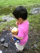 猛暑日の続く毎日。 みなさまいかがお過ごしでしょうか。 わが家はこの夏、パパが休み無しで働いてくれているので、どこか遠くへはなかなか行けないのだけど、半日で帰ってきた日に、川遊びに数回行ってきました。 眠い目をこすりながら、しまじろうを小脇に抱え、川遊び開始のたっくん。 もう1枚の写真は、近所の湧水公園で。 水がきれいで、すんごく冷たかった~! 早く秋が来ないかな~。