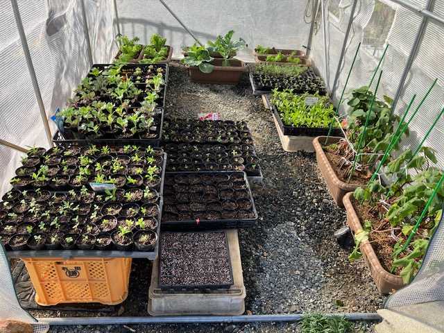 ◇育苗ハウスの中は、花と野菜の苗で一杯です。これ以外に、玉ねぎ苗を別の場所で育てています。