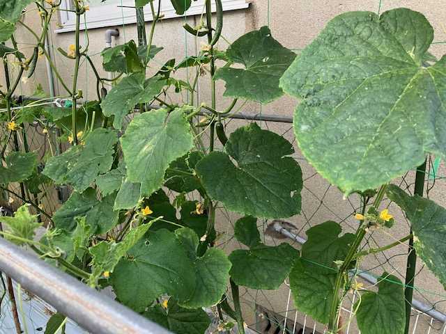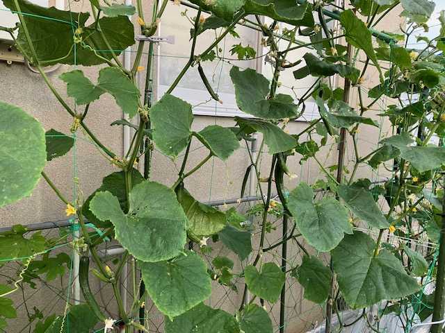 ◇大きくなり始めたキュウリが結構成っています。気温が下がってきましたが、ちゃんと収穫できるでしょうか?