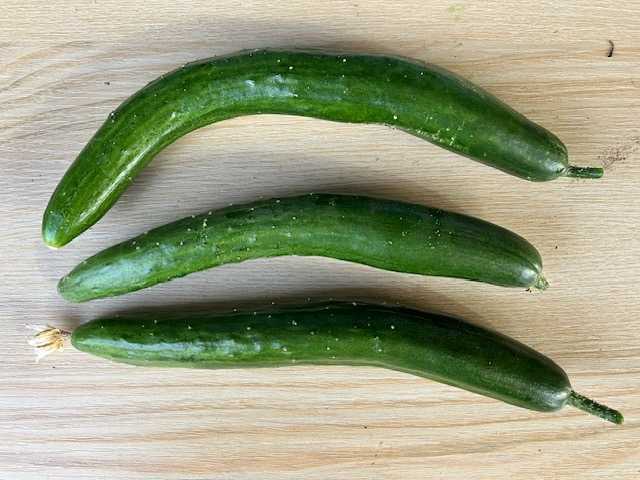 ◇収穫したキュウリです。なんだか夏のキュウリと違ってちょっと弱弱しいです。歯ごたえや味は合格です。