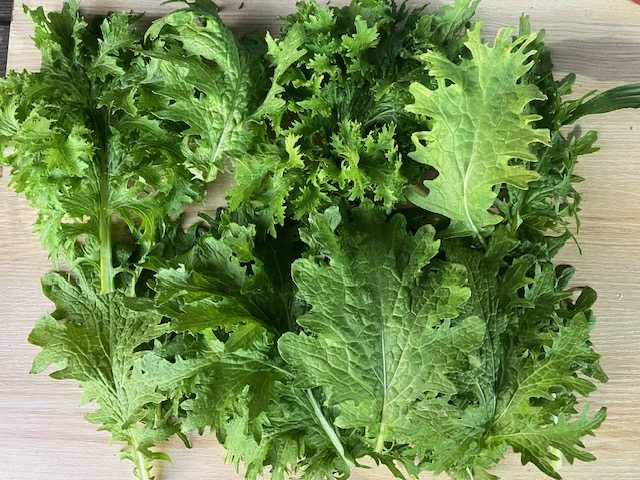 収穫したワサビ菜です。見た感じがちょっと固く見えますが、サラダで食べると、ほんのりワサビ風味がありおいしく食べられます。