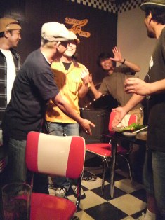 急に「明日の晩、拉致ってもいいですか?」の連絡が入る。。「大丈夫よ!」 って一声。「何するのかなぁ・・・?? 呑みかなぁ・・・??」って思ってたらライブでした(笑)福生の小さなバーのハロウィンパーティーにてライブを決行。。30分ほどのアコースティックライブ。。テキーラをもらって、ビールをもらって、、でも、急に拉致されて来たのに・・・・。全然、音楽やった気になりません。。。なので、、福生といえばチキンシャック。ステージジャックをやりに行こう!! という事になりました。。勢いのある時は面白いほど道がつながるもんで。。チキンシャックのママも快諾。たまたま店近くで黒人パーカッションのJCを発見。そしてそのまま拉致。みんなで音逢わせ。。その音に釣られて、ギターさんも参加(あとで聞くとAV監督さんでした)みんなでワイワイ、ガヤガヤ。。またしてもテキーラご馳走になって・・・。ラーメン食べて・・・。満足したと見えて。帰りの車ではおちてました。そんな拉致な一日。。。
