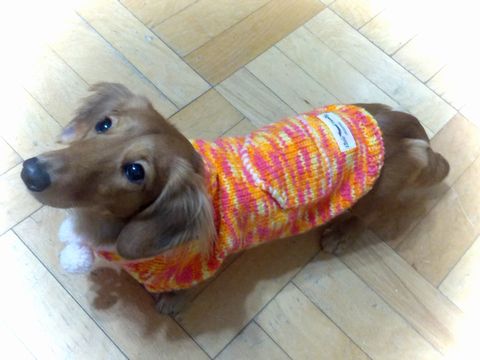 去年の夏前に浴衣を買った☆★Little Family★☆Miniature Dachs Only Shopは、その後お休みされてたんですが、11/22に「2012 年内販売のご案内」のメールが来ました。出張中で、朝早くに目が覚めてメールを見ていたら、真夜中に来たメールを発見。即座にアクセスして、バーゲン会場の在庫から・・・ノースリーブ - ノースリーブ ブラウン 【M】 980円ワンピース - ノースリーブ ブラウンワンピース 【M】 1,200円手編みセーター - カラフルパーカーセーター M 1,380円の3点を注文し終えたのが、5時半頃でした。在庫数が少なかったので、その後9時ころには売り切れになってました。「20%OFF除外商品ですので、心ばかりではありますが送料はサービス」していただきました。昨日届いたんですが、中にはおまけに、トナカイのおもちゃが入ってました\(^o^)/手編みセーターと、ワンピースを着せてみました。セーターは太めの毛糸でしっかりしてます。大きいかなと思ったけど、着せたり脱がせたりを考えると、4.8kgのルーチェにはギリギリでピッタリでした。ワンピースは、落ち着いたブラウンで、良い感じです。飼い主のファッションと合わない気もしますが・・・