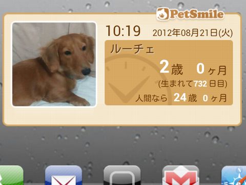 昨日は、ルーチェの2歳の誕生日でした。人間なら24歳くらいということで、もう子供より大人に・・家族全員忘れてました。夜の食事が終わった後で、息子が「ルーちゃん、今日が誕生日やった!?」と思い出して・・・ごめんね、みんな忘れてた。新しい首輪を買ってあげようかということになりましたが・・・PetSmile ~年齢時計~というアプリというか、ウィジェットです。画像は好きなのに変更できます。少し前までは、大学生とか出てたけど、大人になると年齢だけになってしまうのが、ちょっと残念かな。壁紙はiPhoneみたいですが、Androidです。