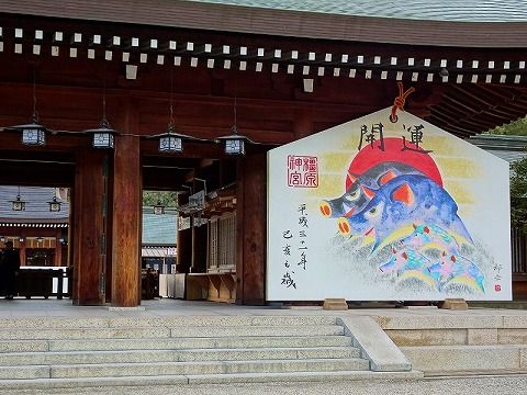 来年は亥年です。橿原神宮の拝殿前には猪の「大絵馬」が飾られていました。