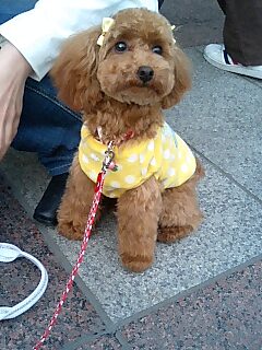 4月から主に犬を扱う学校に通い始めたsagineko。そんなsaginekoが学校帰りに遭遇したこんなワンコ達。みなさん、“プードル”って知ってるでしょ?!でも、“プードル”って言っても大きさが3サイズあるんだ。よく見かける“トイ・プードル”。トイよりちょっと大きい“ミニチュア・プードル”。一番大きい“スタンダード・プードル”。で、今回saginekoが遭遇したのは・・・一番小さい“トイ・プードル”のラムちゃんと一番大きい“スタンダード・プードル”のアッサム君。丁度この2匹、生後8ヶ月と比較しやすい!こんな感じ↓おもいっきりラムちゃんが怖がっちゃってるけど・・・笑”どうやらラムちゃんは、saginekoが通う学校でトリミングをうけた帰りだったみたいで、ちゃんとリボンを付けてますね!!