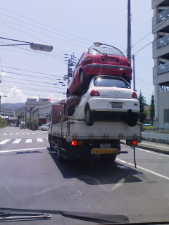 本日、配達中、スゴイものを目撃した。一番上の車がいつ落ちてくるか冷や冷やしながら後ろをついて走っておりました。このままトンネルも走るんだよね。すべてが計算尽くなのかひょっとして何も考えていないのか・・・・親亀こけたら、皆、こける・・・・・・ああ、怖かった。。。゛(/>