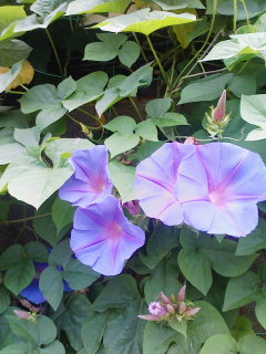 配達中に、何やら怪しい物体を発見。それは、朝顔・・・・・ほらぁ確かに朝顔でしょ?しかし、この朝顔はなんか変?なんかデカイのだ。では、次の画像をご覧下さい。なんと、ビルの3階まで届いている。しかも、青い花をいっぱい咲かせて・・・・うちの娘が育てた朝顔なんか、せいぜい1mほどなんだけど・・・・なんじゃこりゃ・・・・ひょっとして宇宙からやって来た新種か?誰か知っている方いませんか?(・_・")?