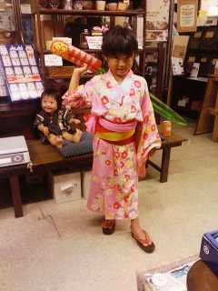 我が町の花火大会は豪快だ。とても、3万人程度の田舎町の花火とは思えない程だ。港の埋め立て地から打ち上げするのであるがかなり近くから花火をみる事ができる。ずっと、上をみなければいけないので、首が疲れるのであるが近くでみる花火はやっぱり迫力が違う。しかも、地形の関係で花火の音が湾の両側の山に反響し、さらに大きく響くのだ。我が町八幡浜。ちゃんぽんや削りかまぼこもいいがやっぱり花火はスゴイと思う。さて、最近、しんのすけの体調が良いので今回は家族全員で花火を見に行く事にした。娘はお気に入りのゆかたを着込み。しんのすけは甚平でおめかしした。そして、花火大会会場へ歩いて向かう。娘もしんのすけも大はしゃぎ。気分はどんどん盛り上がる。すると・・・・・一発目の花火が打ち上がった。ひゅーん・・・・ぱーーーーーん!夜空に轟音と共に、綺麗な光の線が広がる・・・・その瞬間・・・・はしゃいでいたしんのすけの顔がこわばった。2発目の花火が上がる・・・・・ふえ~ん・・・・・・しんのすけは恐怖におののき、火がついたように泣き出した。ヤレヤレ ┐(´-`)┌ マイッタネ マイ奥さんはしぶしぶ、帰路についた。私はと、いうと、娘を連れて花火会場へ。実は、娘は花火をみたいというよりは屋台の夜店へ行きたいのであった。いろんな夜店を回らされてへとへとになる私であった。・・・・・・・・・・・やっと、家に帰ったがおめかししていたハズの娘がなぜか、サムライになっていた。(゜O゜;えっ? なんで?