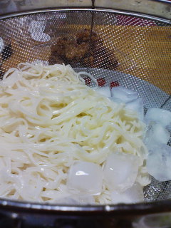 某雪虫さんからいただきました。稲庭うどんです。夏の間ばたばたしていたのですがようやく食する事ができました。さて、このうどん、うどんという名前の割には細い。茹でる前は直線的な乾麺の形もあって「そうめん」に近いかもでも、そうめんにしては、太い・・・・・と、いうわけで、なかなか微妙なものであるがいざ、食してみると・・・・これがびっくり・・・・・この太さにしてはすごい、コシがあるのである。このコシと、つるつるした触感がのどにすばらしく気持ちよいのであった。まぁ、私も「讃岐うどんマン」という芸名を持っているほどうどんにはハマっているのだが讃岐うどんとはまったくの別物のこの稲庭うどん。これは、これで・・・・う~ま~い~ぞぉ!!!!!と、いうわけで、遅ればせながら雪虫(仮名)さん、ありがとう。\(^o^)/