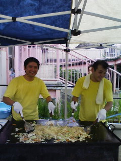 本日は、しんのすけの保育園のお祭りであった。で、私の役目は「焼きそば」巨大な鉄板で15人分を一度につくる。それにしても、暑い!しまったぁ、生ビールサーバーを持ってくるべきだったか?ちなみに、私が焼きそばを焼いている間マイ奥さんは、お店の店番の為、しんのすけをお祭りに連れていけない。と、いうわけで、しんのすけはお祭り欠席であった。まぁ、役目なのでしかたないのであるがなんか変?