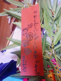 七夕というのは世間的には7月7日なのだが地方によっては、8月7日のところもある。我が地元も後者の方だ。と、いうわけで、昨夜は七夕。ちっちゃい笹の葉に娘が飾り付けをつけていました。どんな事をお願いしているのか短冊を読んでみると・・・・・がぞくぜーいんが しにませんように・・・・・うーむ・・・・・(^_^;)これが6歳児の願い事かい・・・・・・それにしても、今の世の中あまりにも簡単に自分や他人の命を奪う事件が多い。命があまりにも軽く扱われているように感じる。そう考えるとどんなときでも、何があっても死にませんように・・・・生きてさえいればどうにかなる・・・・・常に死を意識するってことは、生きるために常に努力するって事。なかなか深いお願い事ではないか・・・・えっ?私の願い事???・・・・・・そうだね、とりあえず、wiiかなぁ。バキッ!!( -_-)=○()゜O゜)アウッ!