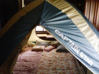 いやぁ、寒くなりましたな。今朝の外気温は約9度。室内でも12度ほどしかありませんでした。今月の最初はTシャツでもよかった程なのに 急激に冬になってるってカンジですね。 と、いうわけで、我が家にキャンプシーズンが到来いたしました。寝室にはテントがお目見えです。(爆) ちょっと大きめのテントなので、大人用の布団を二組敷いて照明+机+パソコン+オイルヒーターが完備されております。まぁ、本来、テントというもの野外で使うものなので室内で使うと、これがとっても温かい。 これでどんな寒い夜だって、一晩中ぬくぬくなのであった。もちろん、子供達も大喜びなのであった。 ここまでするのには理由があって。しんのすけが元々抵抗力が弱く、普通の子供が風邪で済むところを肺炎まで一気にいってしまう。先月も入院したばっかり。おまけに、しんのすけは寝相が悪い。いつもふとんをけっ飛ばして身体が冷たくなっているのであった。 でも、こうやってテントを張ってヒーターを入れておけば例え、ふとんをかぶっていなくても最悪の事態は防げるかな?と、いう事である。 まぁ、しんのすけが丈夫になって風邪をひかなくなったら本来の野外でキャンプをしたいものである。(^◇^;)
