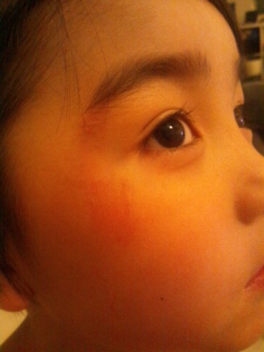 先日、幼稚園で双子がけがをしたと連絡がありました。けがの原因を聞いてみると・・・ドッジボールで二人が同時にボールを追いかけごっつんこ。いっくんの頭が、もっくんの目じりに当たったようでアザになったよ~そんなところまで仲良くしなくていいのにね・・・(笑)