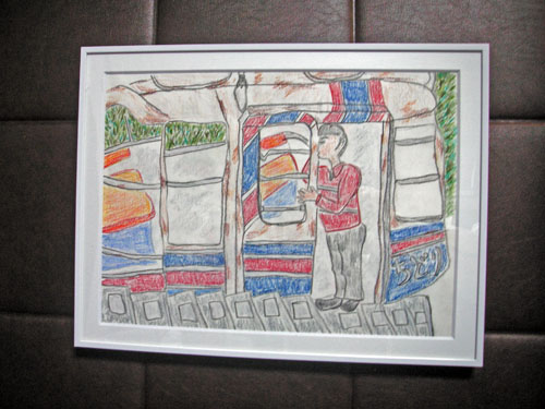 大好きだった鋸山ロープウェーの2代目搬器が架け替えで、最終日に自分が搬器にお別れのキスをしている写真を撮ってフェイスブックにアップしたら、それを見た知人にウケちゃって、彼女がお絵かきの趣味もあったこともあり、わざわざ絵にしてくれました。 後にその原画をクリスマスプレゼント代わりに送ってくれたので、額に入れて飾りたいと思っていたのですが、なかなかヒマがなくて、先日やっと世界堂へ行って額を選び、マット加工してもらいました。僕のロープウェイに対する愛がすごく描かれていると思います。