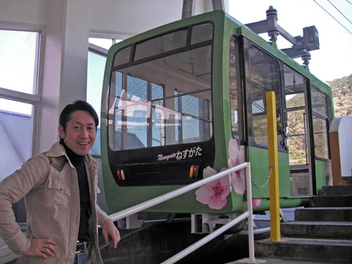 今日は自分のオフ日で天気もよさそうだったので、近場へ行こうと思い立ち、まだ新キャビンになってから乗っていない下田ロープウェイを訪れることに決定!2009年に2代目キャビンから現在の3代目に架け替えになる前に慌てて撮影しに行ったのが最後。もう4年ちかくたってしまったのに驚きです。 新キャビンのデザインが発表になった時、最初は「なんか都バスみたい!」と個人的趣味には合わないなと感じてました。この黄緑色とようかんでも切ったような前後のスパッとした切り口がどうも好きになれませんでしたが、今日実際に見てみると「コレはコレかな!」という感じでした。1号車「ねすがた号」は桜の花をあしらってあります。 2号車「あいぜん号」は「ツワブキ」という花だそうです。山頂の方は風がやや強かったですが、晴天に恵まれジャケットなしでも十分あたたかくて、のんびりと4往復楽しんできました。 本当は帰りにアタミロープウェイにもハシゴしてくる予定でしたが、下田から熱海って電車だとけっこうかかるので、下田で水族館にも寄ったら熱海到着が夕方の5時を過ぎてしまい、とりあえず以前お世話になった昭和レトロな旅館「福島屋旅館」の御主人にお会いしてから帰ろうと立ち寄り、温泉にも入れさせて頂き、東京へ戻りました。