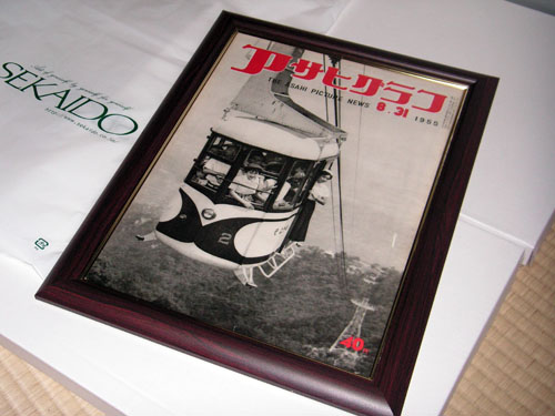 昭和30年8月31日号のアサヒグラフに開業間もない頃の摩耶山ロープウェイの記事が載っていまして(それは「歓喜の索道」の中のコラムに詳しく載せてあります。)、その時の表紙もロープウェイで歴史を感じるとてもいいカバーなので、以前から額に入れて飾りたいと思っていました。しかし仕事が忙しくてなかなか額縁を買いにいくヒマがなかったのですが、やっと昨日実現しました。世界堂に行って雑誌のサイズにピッタリのが見つかったので特注しなくて済みました。 タンスの横に飾りました。う~ん、なかなかいい感じだと思います。自分は昭和30年代頃のロープウェイのキャビンや雰囲気が大好きなので、この表紙はとても魅力的です。だんだん自分の部屋がロープウェイ博物館になってきましたよ。(^-^)