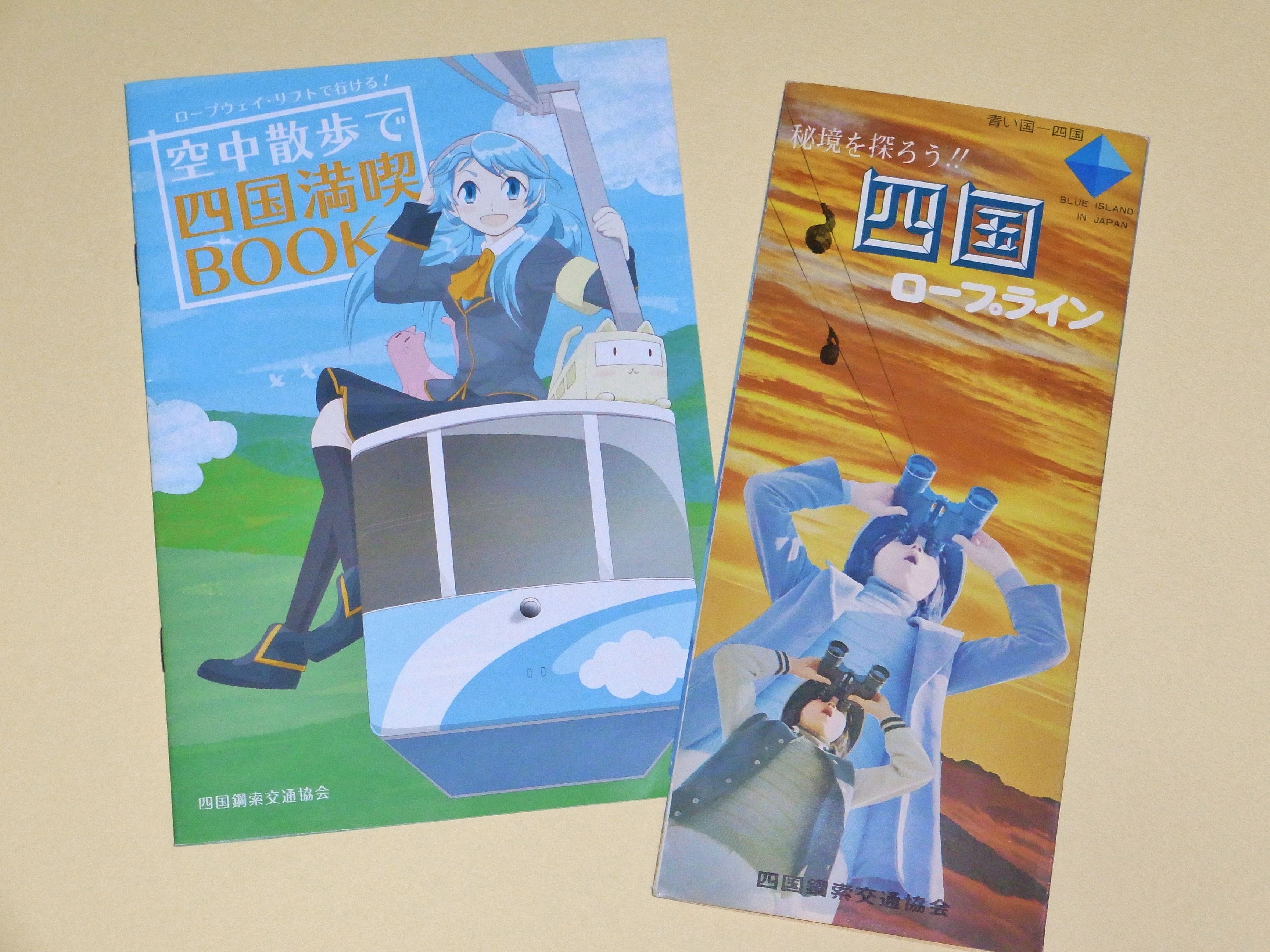四国鋼索交通協会が「空中散歩で四国満喫BOOK」という20ページの小冊子を発行していて、なかなか粋な計らいをしてるなあと思ったのですが、それよりも何十年も前にこの協会が「秘境を探ろう!四国ロープライン」という、同じような目的のパンフレットを発行していることが判明。ハッキリした年代がわからないのですが、パンフレットに「青い国ー四国」というキャッチフレーズがあった。調べてみると日本国有鉄道(今のJR)が「ディスカバージャパン」というキャンペーンをしている時に、四国はそう呼ばれていたようなので、1970年頃のものかもしれない。ロープウェイ、リフト、ケーブルカーなど17ヶ所が紹介されている。五台山ロープモノレール、奥道後ロープウェイ、千羽ロープウェイ、屋島ケーブルなど、現在は廃線になっている場所もあり、現在のパンフレットでは10ヶ所になっている。