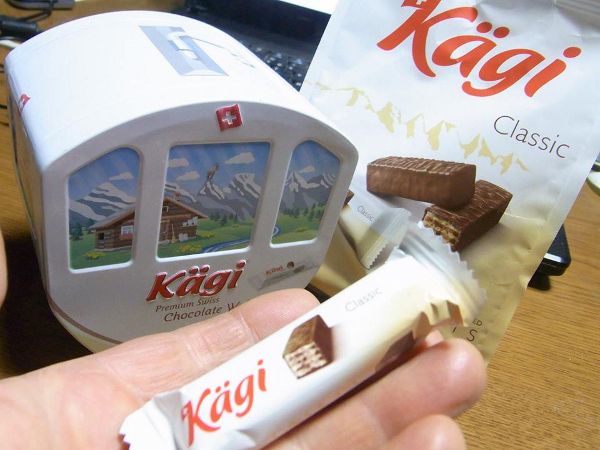 以前ネットオークションでカーギというスイスのチョコレートメーカーの製品で、ロープウェイの搬器をイメージした空き缶を入手しました。スイスではメジャーなメーカーのようですが、たぶんその缶はどこかのロープウェイのお土産品だったと察します。ともあれ中身は入っていなかったので、どんなチョコレートだったのかずっと気になっていたのですが、昨日とある成城石井に行ったら、そのカーギの袋入りのを発見!感じとしてはキットカットをもっと滑らかなミルクチョコレートで包んだような美味しさでした。たいした話題ではありませんが、なんかこの商品が理解できたようで嬉しいです。