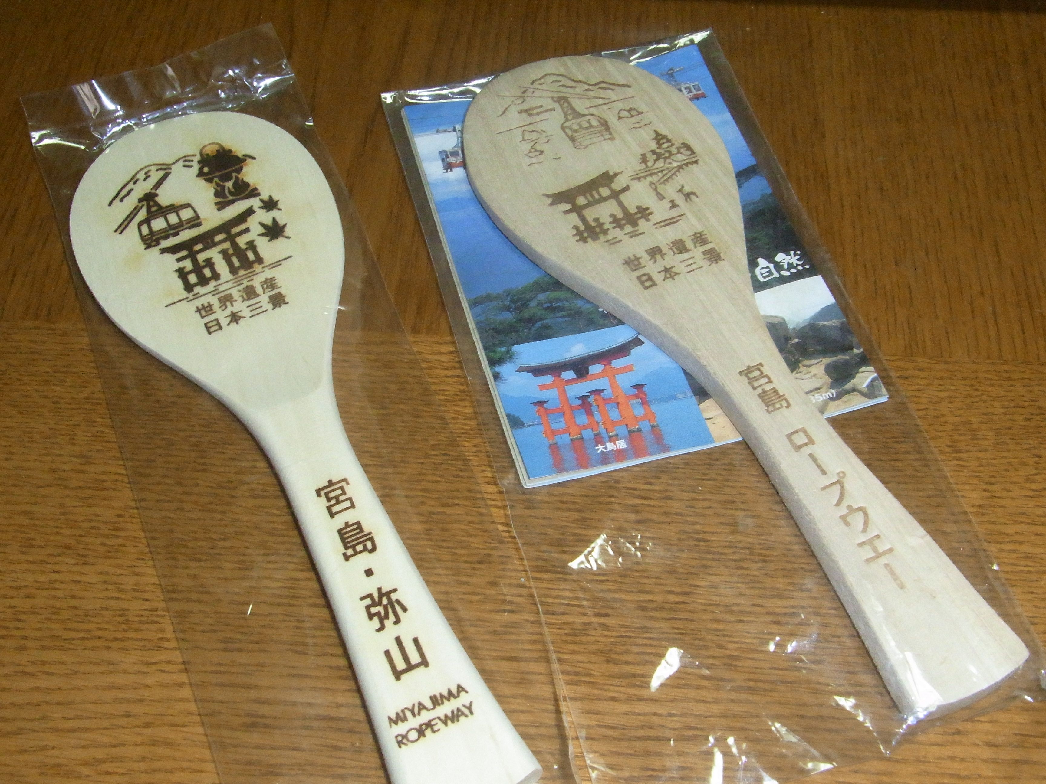 先週末に自分の本業であるタップダンスの公演があり、ある知人から差し入れに宮島ロープウェイのしゃもじをプレゼントして頂きました。ネットで見つけてわざわざ購入してくださったそうです。中のパンフレットの搬器の画像が交換前ので、その搬器交換が行われたのが2008年2月27日から3月7日だったようなので、それ以前の物だと思います。4年ぐらい前に、ある生徒さんが宮島を訪れた時にもらったしゃもじがあったのを思い出して、見比べてみました。まず何といってもちがうのが、搬器のデザインですね。左の新しい方は、ちゃんと交換後の搬器のデザインに変わっています。どちらにも鳥居は描かれていますが、新しい方は茶釜がロープウェイと対等な大きさで描かれています。しゃもじの作りは左側の新しい方が若干舳先が削ってあって丁寧です。 恥ずかしながら、自分はまだ宮島に乗りにいったことがないのですが、ロープウェイに乗りに行くといきなりこんなものを手渡されたりするのでしょうかねえ?もしロープウェイの絵が描いてなかったら、自分はこんなものすぐに捨てちゃうかも。(笑)