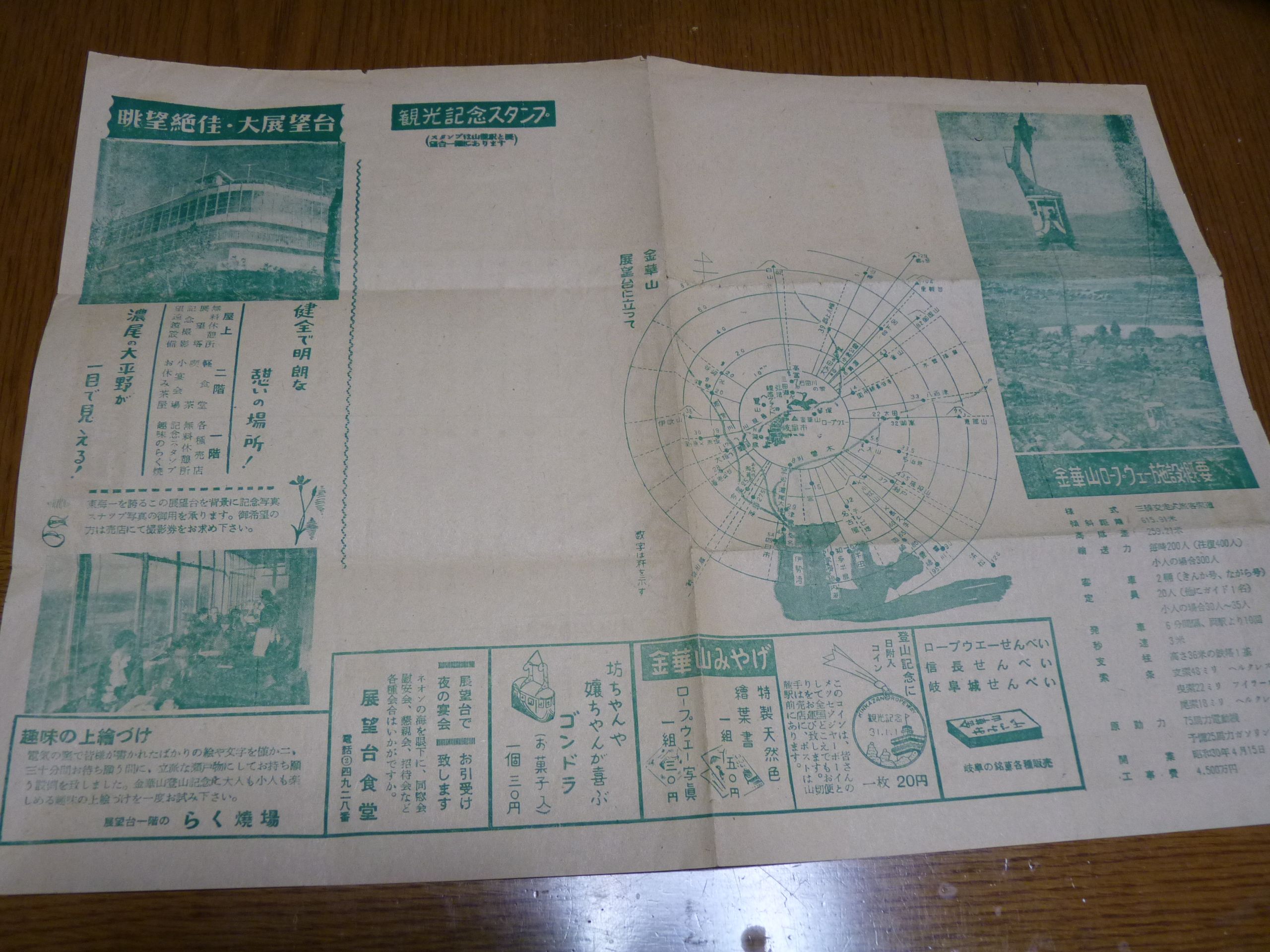 古い金華山ロープウェイの案内チラシを入手しました。昭和30年の開業ですが、チラシの下に記念コインの広告があり、その中の日付刻印が昭和31年なので、たぶんそのころのチラシだと思います。さて、一番興味深かったのはその広告関係でして、「ロープウエーせんべい」とか「ロープウェイ写真一組三十円」など、気になるものがあったことがわかりました。そしてその中でも一番興味を引いたのが、ゴンドラ型のパッケージのお菓子のお土産品が売られていたということです。今でもゴンドラをイメージした箱に入ったお菓子のお土産品はロープウェイではよく見かけますが、こんな昔からその発想があったことが、この広告でわかりました。金華山は戦後の本格的な索道としては第一号と言っても過言ではない場所で、その頃からこういうお土産品があったことは大発見でした。もしこのお菓子の箱がどこかに残っていたら、自分は数万円出してでも欲しいかもしれません。
